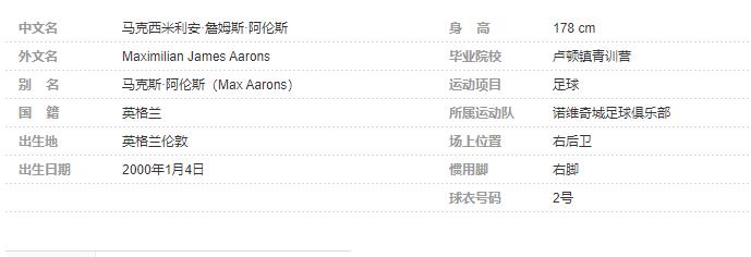马克斯·阿伦斯(Max Aarons),全名:马克西米利安·詹姆斯·阿伦斯(Maximilian James Aarons),2000年1月4日出生于英格兰伦敦,英格兰足球运动员,司职右后卫,现效力于英格兰足球冠军联赛的诺维奇城足球俱乐部。个人简介: