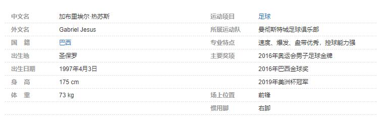 加布里埃尔·热苏斯(Gabriel Jesus),全名加布里埃尔·费尔南多·德·热苏斯(Gabriel Fernando de Jesus),1997年4月3日出生于巴西圣保罗,巴西足球运动员,场上司职前锋,现效力于英格兰足球超级联赛的曼彻斯特城足球俱乐部。个人简介: