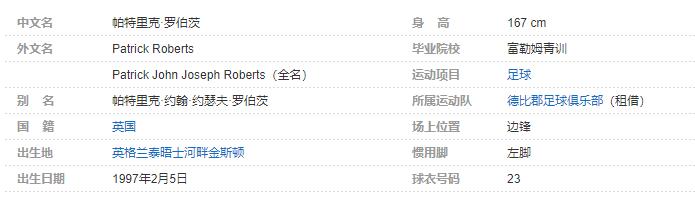 帕特里克·罗伯茨(Patrick Roberts ),1997年2月5日出生于英格兰泰晤士河畔金斯顿,英格兰足球运动员,场上司职边锋,现租借效力于英格兰足球冠军联赛的德比郡足球俱乐部。个人简介: