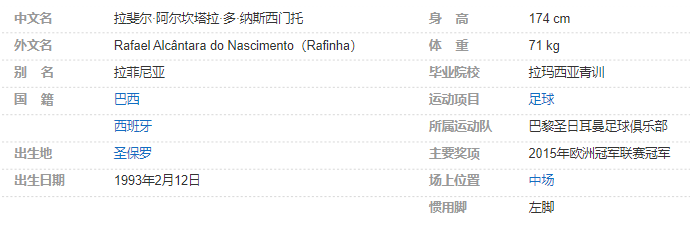 拉菲尼亚(Rafinha),全名拉斐尔·阿尔坎塔拉·多·纳斯西门托(Rafael Alcântara do Nascimento),1993年2月12日出生于巴西圣保罗,拥有巴西/西班牙双重国籍,巴西职业足球运动员,场上司职中场,现效力于巴黎圣日耳曼足球俱乐部。