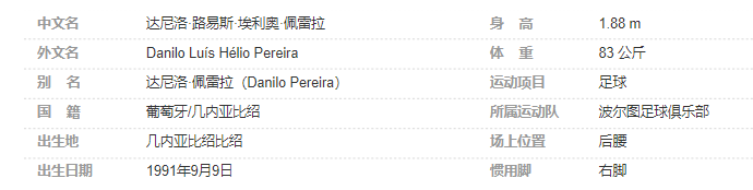 达尼洛-佩雷拉(Danilo Pereira),全名:达尼洛·路易斯·埃利奥·佩雷拉(Danilo Luís Hélio Pereira),1991年9月9日出生于几内亚比绍比绍,葡萄牙足球运动员,司职后腰,现效力于葡萄牙足球超级联赛的波尔图足球俱乐部。