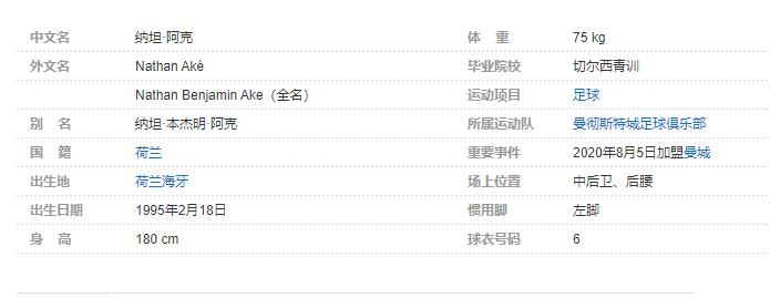 纳坦·阿克(Nathan Ake),1995年2月18日出生于荷兰海牙,荷兰足球运动员,场上司职中后卫/后腰,现效力于英超球队曼彻斯特城足球俱乐部。个人简介: