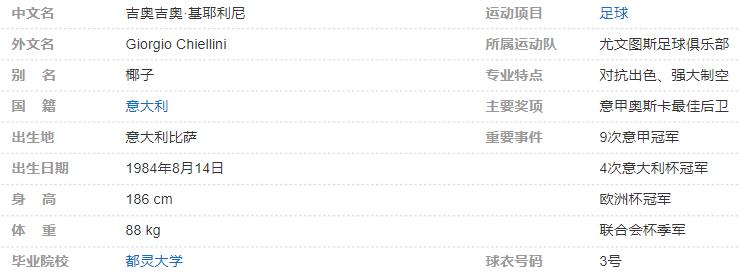 吉奥吉奥·基耶利尼(Giorgio Chiellini),1984年8月14日生于意大利比萨,意大利职业足球运动员,司职中后卫,现效力于意甲的尤文图斯足球俱乐部,并担任尤文图斯俱乐部以及意大利国家队的双料队长。