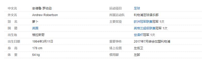 安德鲁·罗伯逊(Andrew Robertson),1994年3月11日出生于英国苏格兰格拉斯哥,苏格兰足球运动员,场上司职左后卫,效力于英格兰足球超级联赛的利物浦足球俱乐部。个人简介:
