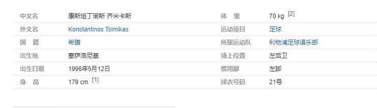 康斯坦丁诺斯·齐米卡斯(Konstantinos Tsimikas),1996年5月12日出生于希腊塞萨洛尼基,希腊足球运动员,场上司职左后卫,现效力于英格兰足球超级联赛的利物浦足球俱乐部。个人简介: