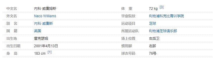 内科·威廉姆斯(Neco Williams),全名:内科·谢伊·威廉姆斯(Neco Shay Williams),2001年4月13日出生于威尔士雷克瑟姆,威尔士足球运动员,场上司职右后卫,现效力于英格兰足球超级联赛的利物浦足球俱乐部。