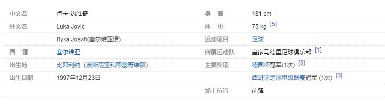 卢卡·约维奇(Luka Jović),1997年12月23日出生于波黑塞族共和国比耶利纳,塞尔维亚职业足球运动员,场上司职前锋,现效力于西班牙足球甲级联赛的皇家马德里足球俱乐部。个人简介