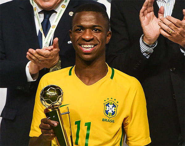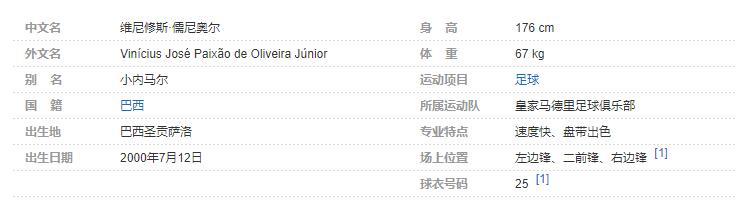 维尼修斯·儒尼奥尔,全名维尼修斯·若泽·派尚·德·奥利韦拉·儒尼奥尔(Vinícius José Paixão de Oliveira Júnior),2000年7月12日出生于巴西里约热内卢州圣贡萨洛市,巴西职业足球运动员,场上司职前锋,现效力于西班牙的皇家马德里足球俱乐部。个人简介
