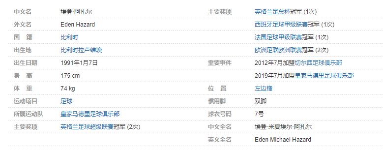 埃登·阿扎尔(Eden Hazard),全名埃登·米夏埃尔·阿扎尔(Eden Michael Hazard),1991年1月7日出生于比利时拉卢维埃,比利时足球运动员,司职左边锋,效力于西班牙足球甲级联赛的皇家马德里足球俱乐部。个人简介