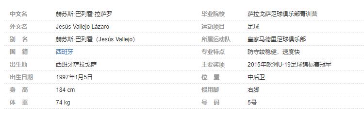 赫苏斯·巴列霍(Jesús Vallejo),全名赫苏斯·巴列霍·拉萨罗(Jesús Vallejo Lázaro ),1997年1月5日出生于西班牙萨拉戈萨,西班牙职业足球运动员,司职中后卫,现效力于西班牙足球甲级联赛的皇家马德里足球俱乐部。