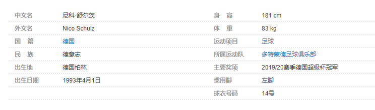 尼科·舒尔茨(Nico Schulz),1993年4月1日出生于柏林,是一名德国职业足球运动员,场上位置为左后卫,现效力于德国足球甲级联赛的多特蒙德足球俱乐部。个人简介