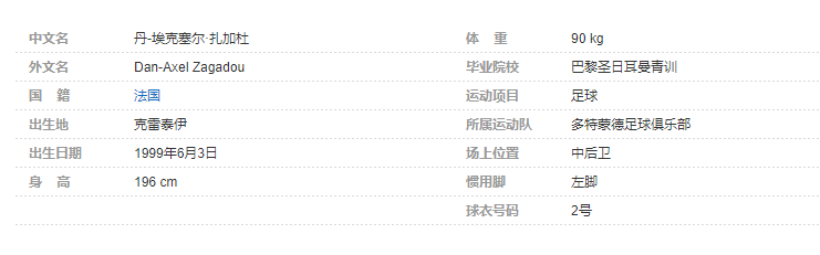 丹-埃克塞尔·扎加杜(Dan-Axel Zagadou),1999年6月3日出生于法国克雷泰伊,法国足球运动员,场上司职中后卫,现效力于德甲的多特蒙德足球俱乐部。