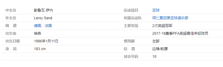 勒鲁瓦·萨内(Leroy Sané),全名勒鲁瓦·阿齐兹·萨内(Leroy Aziz Sané),1996年1月11日出生于德国埃森,德国足球运动员,司职边锋/前腰 ,现效力于德甲的拜仁慕尼黑足球俱乐部 。个人简介