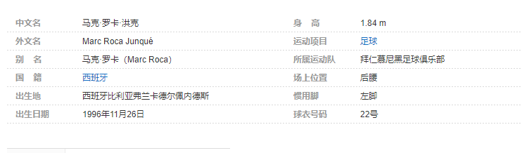 马克·罗卡(Marc Roca),全名马克·罗卡·洪克(Marc Roca Junqué),1996年11月26日出生于西班牙比利亚弗兰卡德尔佩内德斯,西班牙足球运动员,司职后腰,效力于德国足球甲级联赛的拜仁慕尼黑足球俱乐部。个人简介