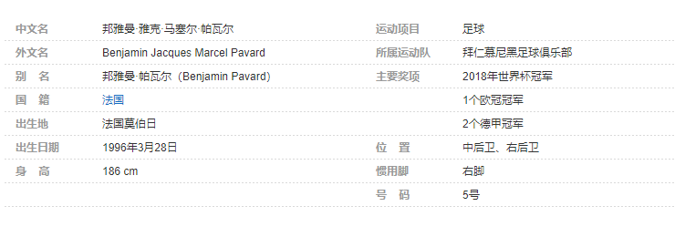 邦雅曼·帕瓦尔(Benjamin Pavard),全名邦雅曼·雅克·马塞尔·帕瓦尔(Benjamin Jacques Marcel Pavard),1996年3月28日出生于法国莫伯日,法国足球运动员,场上司职中后卫,可兼任右后卫,效力于德国足球甲级联赛的拜仁慕尼黑足球俱乐部。个人简介
