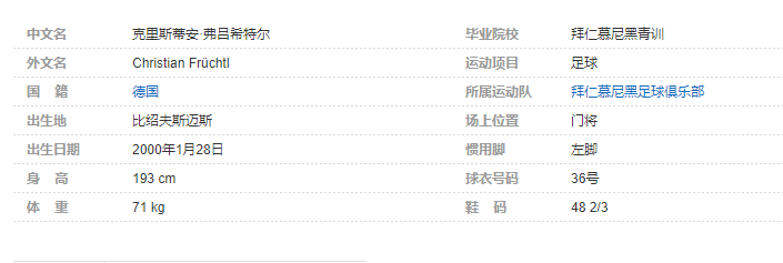 克里斯蒂安·弗吕希特尔(Christian Früchtl),2000年1月28日出生于德国比绍夫斯迈斯,德国足球运动员,场上司职门将,现效力于德甲的拜仁慕尼黑足球俱乐部。个人简介