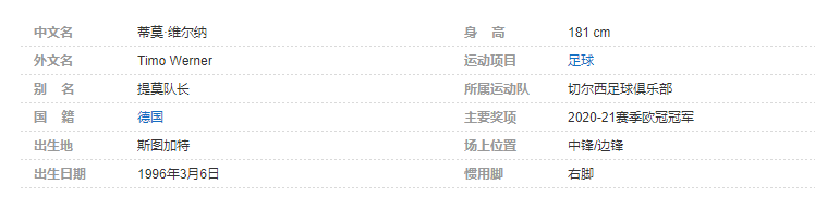 蒂莫·维尔纳(Timo Werner),1996年3月6日出生于德国斯图加特,德国男子职业足球运动员,司职中锋,亦可胜任边锋,效力于英超切尔西足球俱乐部。个人简介