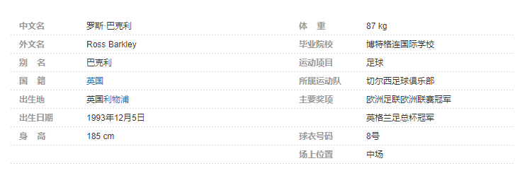 罗斯·巴克利(Ross Barkley),1993年12月5日出生于英国利物浦,英格兰足球运动员,场上司职中场,效力于英格兰足球超级联赛的切尔西足球俱乐部 。个人简介