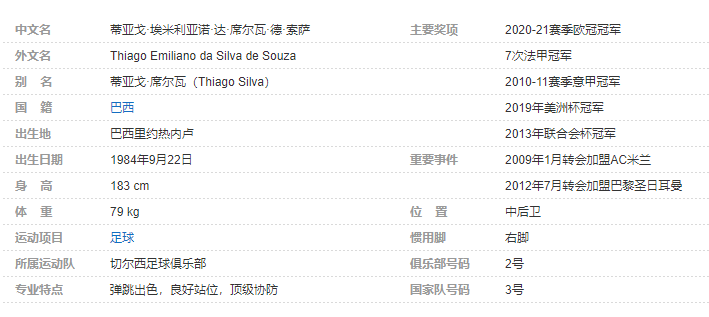 蒂亚戈·席尔瓦(Thiago Silva),全名蒂亚戈·埃米利亚诺·达·席尔瓦·德·索萨(Thiago Emiliano da Silva de Souza),1984年9月22日生于巴西里约热内卢,巴西足球运动员,司职中后卫,效力于英格兰足球超级联赛的切尔西足球俱乐部。