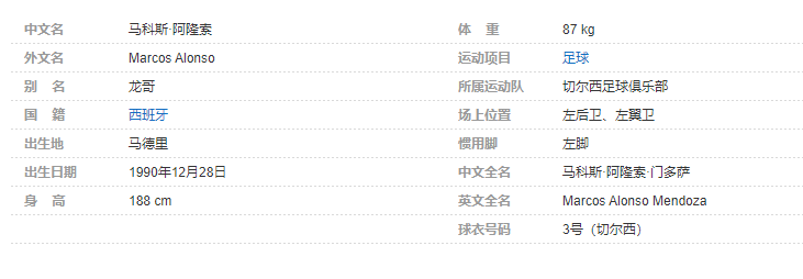 马科斯·阿隆索(Marcos Alonso),1990年12月28日出生于西班牙马德里,西班牙足球运动员,场上司职左后卫、左翼卫,效力于英超切尔西足球俱乐部 。个人简介