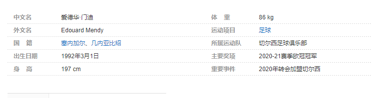 爱德华·门迪(Edouard Mendy),生于1992年3月1日,拥有几内亚比绍/塞内加尔双重国籍,塞内加尔职业足球运动员,司职门将,现效力于英格兰足球超级联赛的切尔西足球俱乐部。