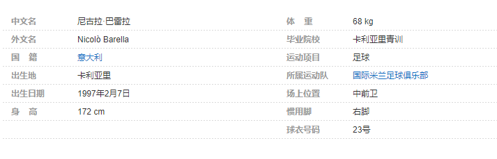 尼古拉·巴雷拉(Nicolò Barella),1997年2月7日出生于意大利卡利亚里,意大利足球运动员,场上司职中前卫,现效力于意甲的国际米兰足球俱乐部。个人简介