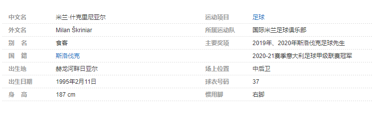 米兰·什克里尼亚尔(Milan Škriniar),1995年2月11日出生于斯洛伐克赫龙河畔日亚尔,斯洛伐克男子职业足球运动员,司职中后卫,效力于意甲国际米兰足球俱乐部。个人简介
