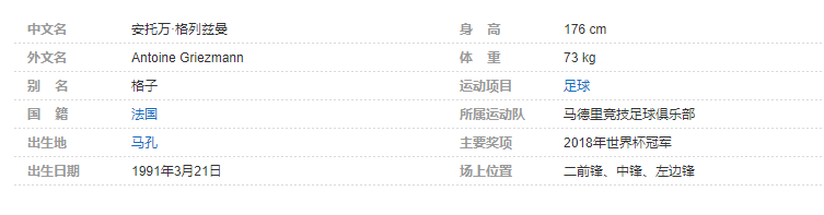 安托万·格列兹曼(Antoine Griezmann),1991年3月21日出生于法国马孔,法国足球运动员,司职前锋,现效力于西班牙的马德里竞技足球俱乐部 。