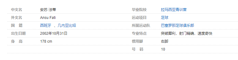 安苏·法蒂(Ansu Fati),全名安苏曼·法蒂·维埃拉(Anssumane Fati Vieira)2002年10月31日出生于几内亚比绍,西班牙足球运动员,司职前锋,现效力于西班牙足球甲级联赛的巴塞罗那足球俱乐部。个人简介
