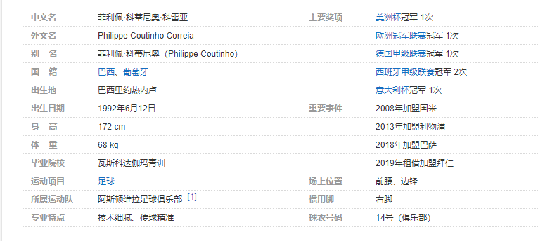 菲利佩·科蒂尼奥(Philippe Coutinho),全名菲利佩·科蒂尼奥·科雷亚(Philippe Coutinho Correia),1992年6月12日出生于巴西里约热内卢,巴西足球运动员,场上司职前腰,亦可胜任边锋。现效力于英格兰的阿斯顿维拉足球俱乐部。个人简介