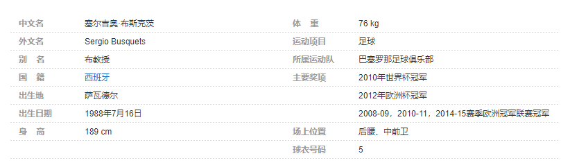 塞尔吉奥·布斯克茨(Sergio Busquets),全名塞尔吉奥·布斯克茨·布尔戈斯(Sergio Busquets Burgos),1988年7月16日出生于西班牙萨瓦德尔,西班牙足球运动员,场上司职后腰、中前卫,现效力于西班牙足球甲级联赛的巴塞罗那足球俱乐部。个人简介