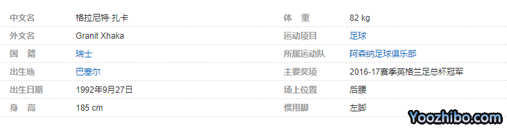格拉尼特·扎卡(Granit Xhaka),1992年9月27日出生于瑞士的西北部城市巴塞尔,瑞士足球运动员,场上司职后腰,效力于英超的阿森纳足球俱乐部。个人简介