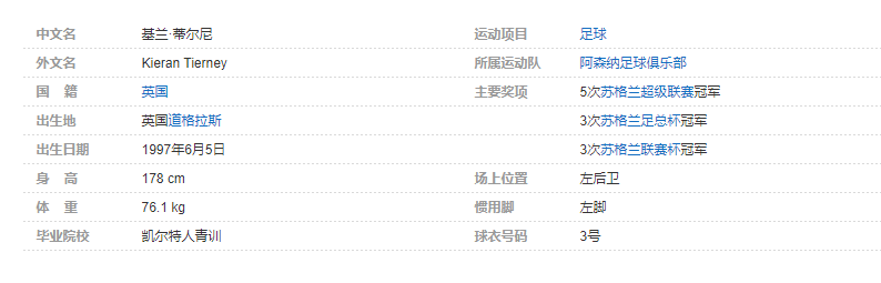 基兰·蒂尔尼(Kieran Tierney),1997年6月5日出生于英国道格拉斯,苏格兰足球运动员,场上司职左后卫,效力于英超联赛的阿森纳足球俱乐部。个人简介