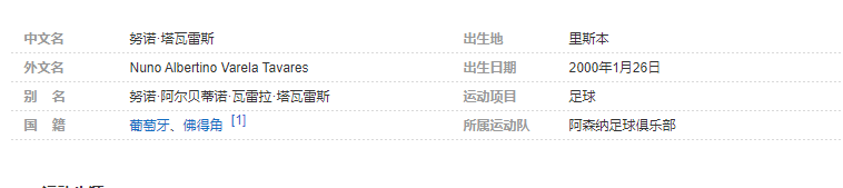 努诺·塔瓦雷斯(Nuno Tavares),2000年1月26日出生于里斯本,葡萄牙职业足球运动员,司职后卫。现效力于英格兰足球超级联赛的阿森纳足球俱乐部。