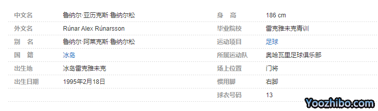 鲁纳尔·亚历克斯·鲁纳尔松(Rúnar Alex Rúnarsson),1995年2月18日出生于冰岛雷克雅未克,冰岛足球运动员,场上司职门将,现效力于比利时足球甲级联赛的奥哈瓦里足球俱乐部。个人简介