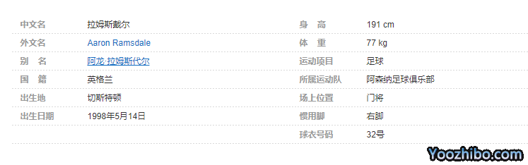 阿龙·拉姆斯戴尔(Aaron Ramsdale),1998年5月14日出生于英格兰切斯特顿,英格兰足球运动员,场上司职门将,现效力于英格兰足球俱乐部阿森纳。个人简介