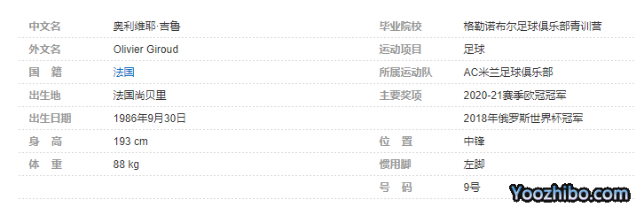 奥利维耶·吉鲁(Olivier Giroud),全名奥利维耶·若纳唐·吉鲁(Olivier Jonathan Giroud),1986年9月30日出生于法国尚贝里,法国足球运动员,场上司职中锋,现效力于意大利足球甲级联赛的AC米兰足球俱乐部。
