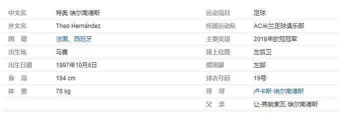 特奥·埃尔南德斯(Theo Hernández),1997年10月6日出生于法国马赛,法国足球运动员,场上司职左后卫,现效力于意大利足球甲级联赛的AC米兰足球俱乐部。个人简介