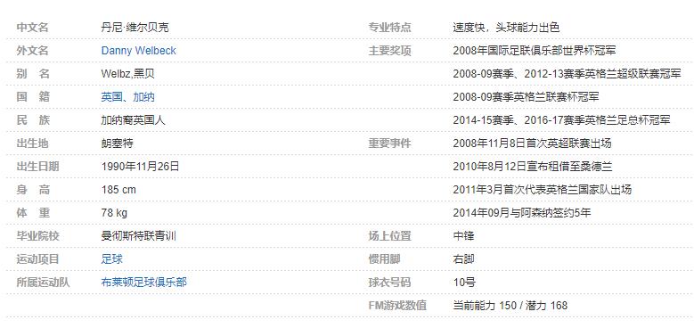 丹尼·维尔贝克(Danny Welbeck),全名丹尼尔·尼·塔基·门萨·维尔贝克(Daniel Nii Tackie Mensah Welbeck),1990年11月26日出生于英格兰曼彻斯特的朗塞特,英格兰足球运动员,场上司职中锋,现效力于英超的布莱顿足球俱乐部。个人简介