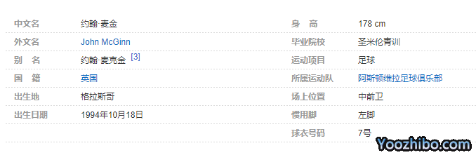 约翰·麦金(John McGinn),1994年10月18日出生于苏格兰格拉斯哥,苏格兰足球运动员,场上司职中前卫,现效力于英超的阿斯顿维拉足球俱乐部。