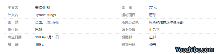 泰隆·明斯(Tyrone Mings),1993年3月13日出生于英格兰巴斯,英格兰足球运动员,场上司职中后卫,现效力于英格兰足球超级联赛的阿斯顿维拉足球俱乐部,亦担任球队队长。个人简介