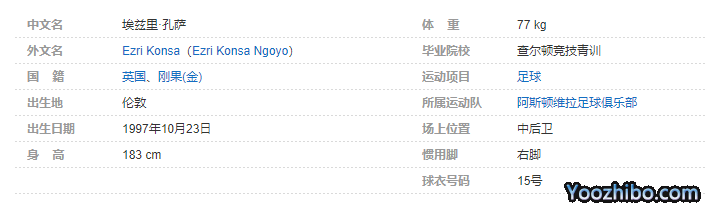 埃兹里·孔萨(Ezri Konsa),全名埃兹里·孔萨·恩戈约(Ezri Konsa Ngoyo),1997年10月23日出生于伦敦,英格兰足球运动员,场上司职中后卫,效力于英超的阿斯顿维拉足球俱乐部。个人简介