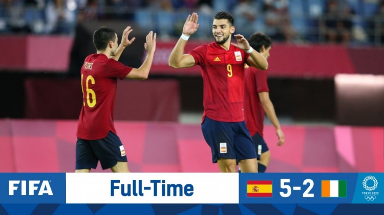 24直播网7月31日讯 北京时间7月31日下午16:00,东京奥运会男足第一场1/4决赛,西班牙对阵科特迪瓦。上半场,明格萨伤退,拜利角球破僵,奥尔莫扳平,乌奈-西蒙神扑,奥亚萨瓦尔越位进球。半场结束,西班牙暂1-1科特迪瓦。下半场,阿森西奥中框,格拉德尔小角度破门,拉法-米尔绝平。常规时间90分钟结束,西班牙2-2科特迪瓦进加时。加时赛上半场,拜利禁区内手球奥亚萨瓦尔点射。加时赛下半场,拉法-米尔连入两球戴帽。西班牙5-2淘汰科特迪瓦,四强战将面对日本和新西兰之间的胜者。