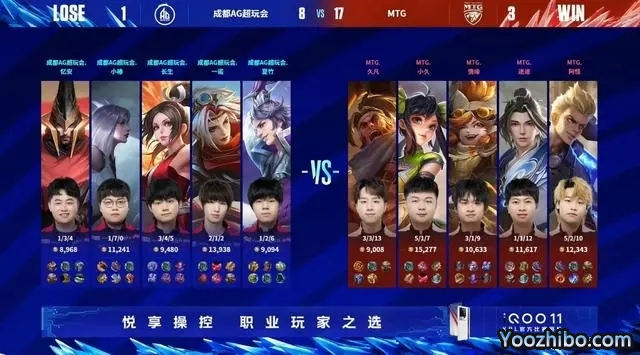 第三局,成都AG超玩会蓝色方,拿到了阿古朵+黄忠。MTG红色方,拿到了澜+虞姬。开局MTG击杀鲁班大师,拿到一血。6分钟,MTG直推中路一塔。9分钟,MTG钟馗钩到并瞬秒阿古朵,MTG直推下路高地,经济差拉开七千。决胜团,MTG先手击杀阿古朵,直推水晶,拿下赛点。