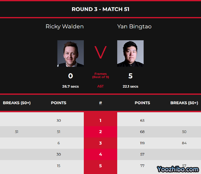 第五局,沃顿见大势已去,无心恋战,简单失误给了颜丙涛二次上手机会,颜丙涛打出一杆57分50+,77-15锁定胜局,完美收官,5-0大胜沃顿晋级16强。