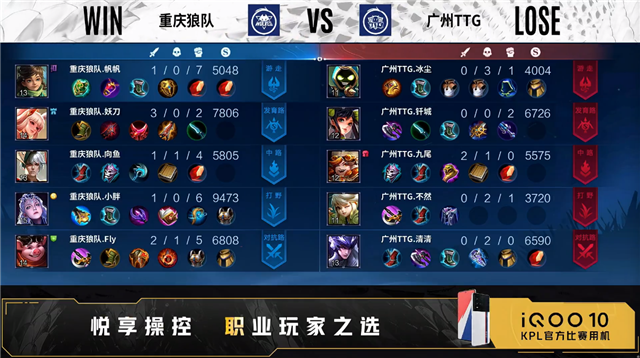 双方常规开局。48秒重庆狼队中路击杀东皇太一拿到一血。3分08秒重庆狼队拿下暴君。3分19秒广州TTG暴君处击杀王昭君。4分59秒广州TTG中路击杀老夫子。5分26秒双方中路1换1。5分41秒广州TTG拿下主宰。6分09秒重庆狼队野区击杀蒙恬。6分19秒重庆狼队摧毁敌方中路外塔。7分35秒中路团战双方1换1。7分43秒广州TTG拿下暴君。8分22秒重庆狼队对抗路击杀娜可露露。9分29秒重庆狼队发育路击杀蒙恬。10分整重庆狼队摧毁敌方中路二塔。11分整高地团战重庆狼队打出0换4。11分21秒重庆狼队摧毁敌方水晶拿下比赛。