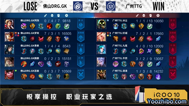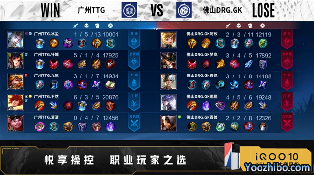 开局双方正常抢线。49秒佛山DRG.GK击杀橘右京,拿下一血,双方打出1换1。2分08秒广州TTG拿下主宰。2分38秒中路广州TTG击杀公孙离,打出0换1。3分59秒广州TTG拿下暴君。4分20秒河道广州TTG击杀夏洛特,打出0换2,摧毁敌方对抗路外塔。5分43秒佛山DRG.GK摧毁敌方对抗路外塔,广州TTG摧毁敌方发育路外塔。6分47秒广州TTG摧毁敌方对抗路二塔,佛山DRG.GK拿下主宰。9分25秒广州TTG拿下暴君。10分39秒发育路佛山DRG.GK击杀马超,打出0换1。11分42秒广州TTG拿下暗影暴君,中路击杀阿古朵,橘右京二连击破,打出1换3,摧毁敌方中路外塔、二塔。13分01秒广州TTG拿下暗影主宰,摧毁敌方发育路二塔。15分28秒广州TTG拿下暗影暴君。16分08秒发育路广州TTG击杀夏洛特,摧毁敌方发育路高地。16分52秒广州TTG拿下暗影主宰,摧毁敌方对抗路高地。18分59秒中路广州TTG击杀夏洛特,拿下暗影暴君。21分09秒广州TTG拿下风暴龙王,橘右京二连击破,马超二连击破,打出0换4,摧毁水晶拿下比赛。