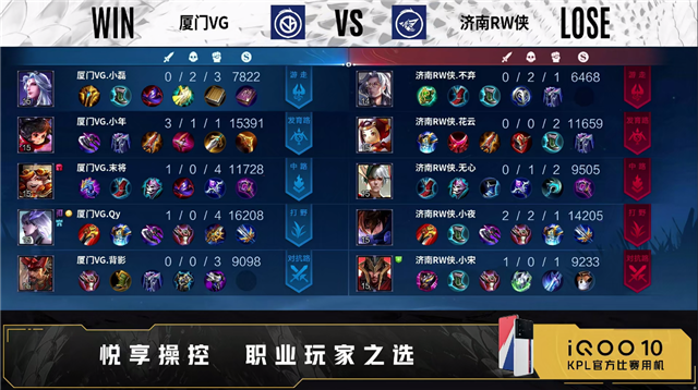 第一局开局厦门VG入侵敌方野区。5分09秒厦门VG摧毁敌方发育路外塔,随后拿下先知主宰。9分05秒厦门VG摧毁敌方对抗路外塔。9分08秒厦门VG拿下暴君。10分20秒厦门VG摧毁敌方发育路二塔。10分40秒厦门VG拿下暗影主宰。11分15秒厦门VG拿下暗影暴君。11分33秒厦门VG摧毁敌方中路外塔。12分12秒厦门VG对抗路击杀鲁班大师拿下一血,随后摧毁敌方对抗路二塔。12分50秒发育路团济南RW侠打出0换2。14分34秒厦门VG拿下暗影主宰。15分07秒济南RW侠摧毁敌方发育路外塔。15分29秒厦门VG摧毁敌方中路二塔。16分20秒厦门VG拿下暗影暴君。17分04秒厦门VG发育路击杀澜。18分17秒厦门VG拿下暗影主宰。19分钟发育路团厦门VG打出1换2。19分26秒厦门VG先后摧毁敌方发育路、中路高地塔。19分39秒厦门VG摧毁敌方水晶拿下比赛。