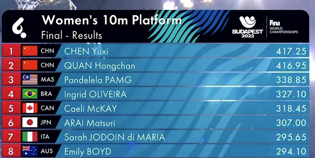 24直播网讯 6月28日,国际泳联布达佩斯世锦赛女子单人10米跳台决赛,陈芋汐以总分417.25分夺得金牌,实现卫冕,同时在大赛的决赛复仇全红婵。全红婵总分416.95分获得银牌,这也是她个人世锦赛首枚奖牌,中国跳水队包揽该项目的金银牌,恭喜。