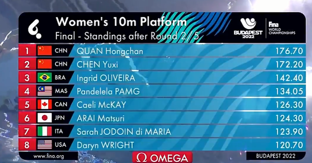 陈芋汐的动作是难度3.3的626C,完成的相当好,得到85.80分,反超全红婵,升至第一名。